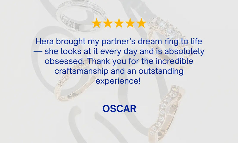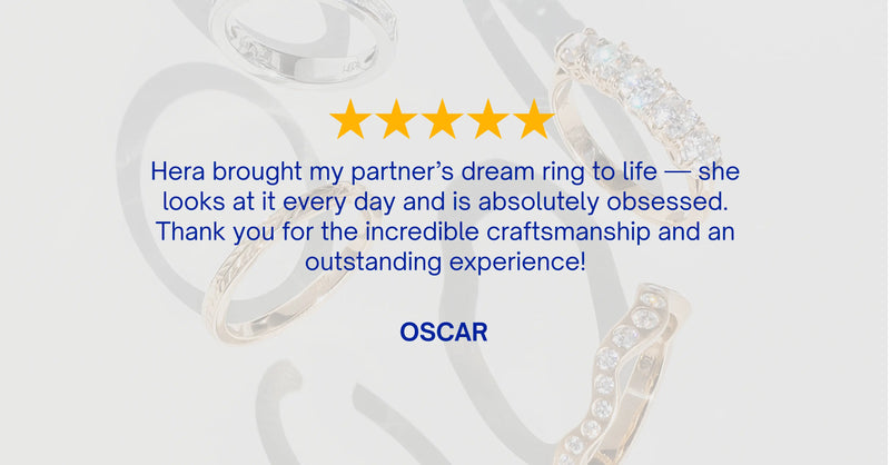Noah Rosenstein“Easily the best experience I could have had. Lauren was so kind, encouraging, and explained all the ins and outs of everything! She worked with me on the design and explained the positives and negatives on each idea so that I could make an informed decision. I received the final product and it is gorgeous, classic, elegant, and just enough flashiness for my partner.”